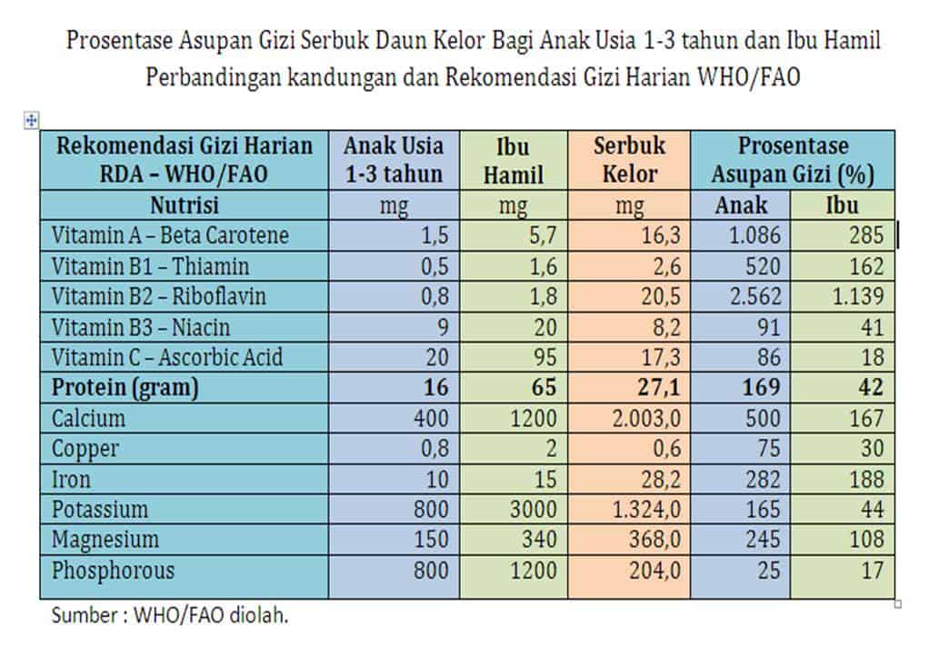 potasium pada pisang. Serbuk daun Kelor memiliki dampak positif terbesar pada mereka yang lebih rentan terhadap kekurangan gizi, ibu hamil atau menyusui, anak-anak pada usia penyapihan, penderita HIV/AIDS, dan manula. Anak kurang gizi usia 1-3 tahun sebaiknya mengkonsumsi tiga sendok makan (25 g) serbuk daun Kelor setiap hari dan Wanita hamil atau menyusui harus mengkonsumsi enam sendok makan (50 g).
